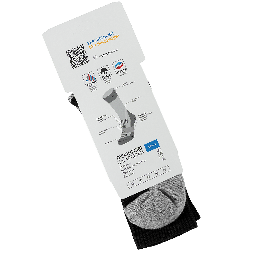 Утеплені трекінгові шкарпетки з активними термо-зонами та демпферними (потовщені махрою) ділянками. Зберігають тепло, а також забезпечують вентиляцію стопи та відведення вологи під час активного руху.